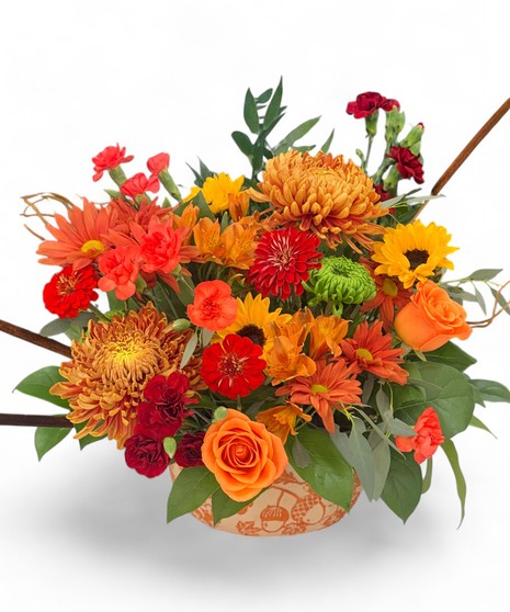 This vibrant autumn bouquet bursts with warm shades of orange, red, and gold, accented by touches of lime green. Featuring roses, chrysanthemums, zinnias, alstroemeria, carnations, and sunflowers, it’s a stunning celebration of the season. Lush greenery and a patterned ceramic container complete the harvest-inspired look. Perfect for adding warmth and color to any fall occasion or home décor.
