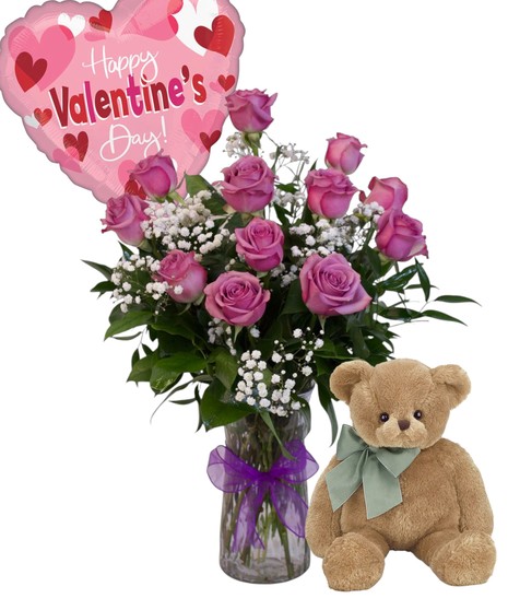 Say “Happy Valentine’s Day” in the sweetest way with this charming gift bundle! This package features a lush arrangement of purple roses accented with delicate baby’s breath and fresh greenery, designed in a clear glass vase and finished with a purple ribbon for an elegant touch. Paired with a soft plush teddy bear and a festive heart-shaped Valentine’s balloon, it’s the perfect all-in-one surprise for someone special.