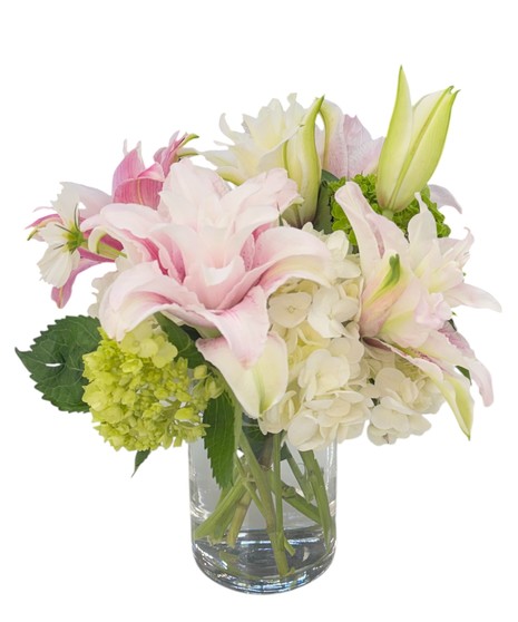 Soft, graceful, and timeless — this arrangement pairs lush white hydrangeas with delicate light green blooms and striking pink Oriental lilies. Presented in a clear glass vase, Blush Elegance radiates freshness and sophistication, making it the perfect gift for anniversaries, celebrations, or simply brightening someone’s day with refined beauty.