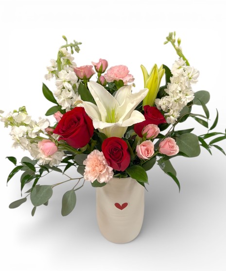 Endless Romance is a graceful Valentine’s bouquet that blends classic passion with soft, modern elegance. At its heart, a luminous white lily opens wide, symbolizing purity and devotion, surrounded by rich red roses that speak timelessly of deep love. Blushing pink spray roses and delicate carnations add warmth and tenderness, while tall white stock flowers bring height, fragrance, and a sense of serenity.