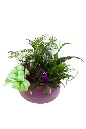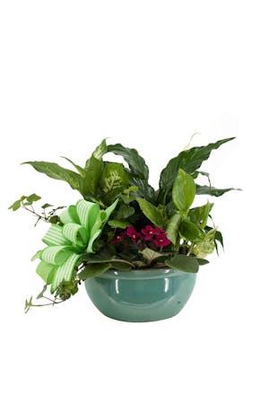 This elegant arrangement features a curated mix of lush green plants paired with a blooming plant, beautifully potted together in one container. Each creation is dressed up with a decorative bow, thoughtfully selected to complement the overall look.