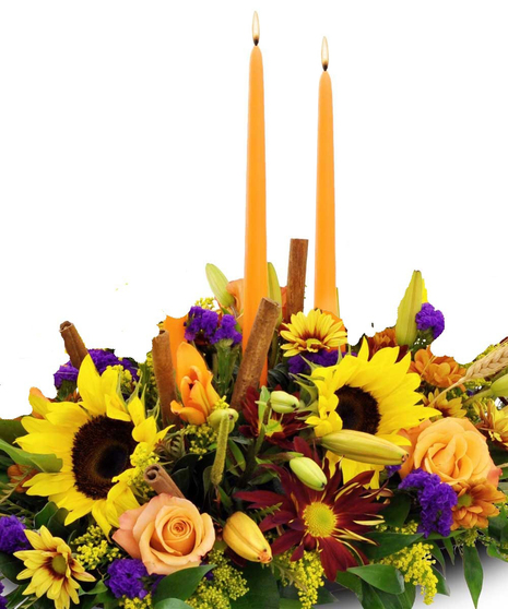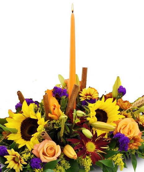I wide variety of autumn's freshest stems are artfully put together with candles and ribbon for a truly beautiful centerpiece. Your Thanksgiving table will be stunning. Send this one as a hostess gift and you will be appreciated!