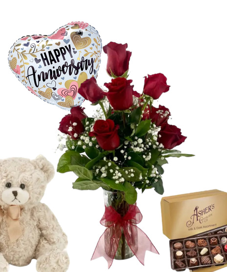 Dozen red roses accompanied by Huggles the teddy bear, box of chocolates, and anniversary mylar balloon!