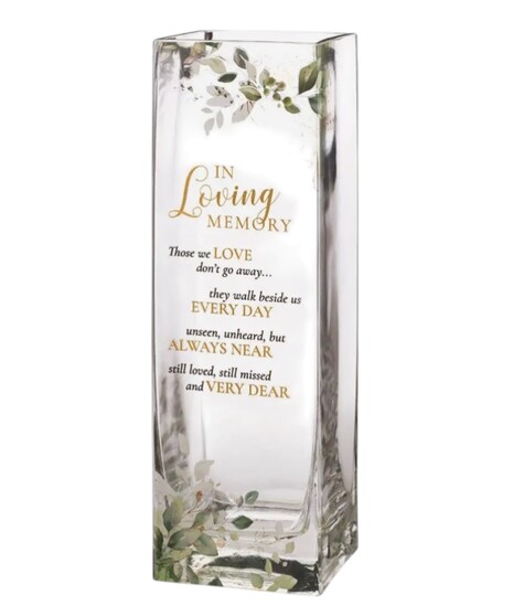 This elegant sympathy arrangement features large white lilies surrounded by soft white blooms and fresh green accents, creating a peaceful and graceful presentation. The flowers are arranged in a clear glass keepsake vase that adds both beauty and lasting meaning to the piece. The vase is decorated with gold and black script that reads, “In Loving Memory” at the top, followed by the message: “Those we LOVE don’t go away… they walk beside us EVERY DAY unseen, unheard, but ALWAYS NEAR still loved, still missed and VERY DEAR.” The combination of crisp whites and vibrant greens gives the arrangement a serene, uplifting feel while honoring remembrance. It’s a thoughtful tribute designed to offer comfort while leaving behind a meaningful keepsake.