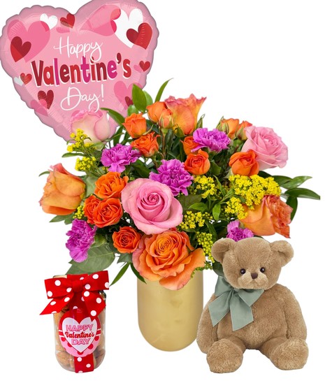 This beautiful gift features a vibrant Peach Bliss floral arrangement designed with peach and pink roses, playful pops of purple blooms, and fresh seasonal accents, all arranged in a soft neutral vase. A festive Happy Valentine’s Day balloon adds a fun, celebratory touch.