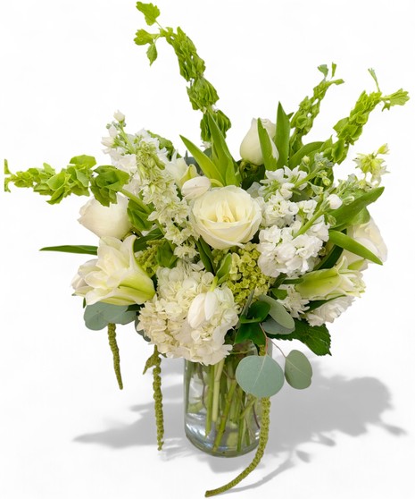 A timeless all-white arrangement featuring roses, hydrangeas, tulips, stock, and snapdragons accented with bells of Ireland, cascading amaranthus, and eucalyptus. Presented in a clear glass vase, it’s a serene and elegant choice for any occasion.