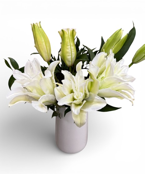 Pure Serenity is an elegant arrangement of creamy white double lilies nestled in fresh, flowing greenery. With layers of soft petals and unopened buds that promise days of continued beauty, this bouquet offers a calming presence and timeless grace. Designed in a clean white ceramic vase, it’s a perfect choice for sympathy, remembrance, or any moment that calls for quiet beauty and comfort.
