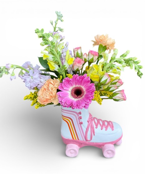 Roll into spring with this playful and colorful arrangement designed in an adorable retro rollerskate keepsake container. Bright and cheerful flowers—including a vibrant pink gerbera daisy, peach carnations, soft pink spray roses, pastel stock, yellow snapdragons, and touches of golden solidago—create a lively mix of texture and color. The nostalgic skate container with rainbow stripes adds a fun vintage vibe, making this bouquet a perfect gift for birthdays, celebrations, or anyone who loves a little retro charm.