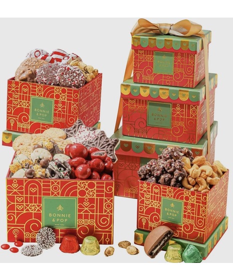 The Seasons Abundance Gift Tower is a three-tier Christmas gift wrapped in shimmering gold ribbon and filled with gourmet holiday treats like chocolates, nuts, caramels, and cookies. Each item is individually wrapped for freshness and easy sharing. The elegant packaging makes it gift-ready straight out of the box. It’s perfect for family gatherings, corporate gifting, holiday parties, or hostess gifts.