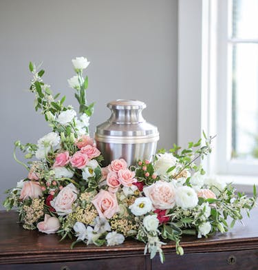 Soft shades of pink and white surround the urn with beauty. A variety of roses, hypericum berries and other accompanying stems with make this a gorgeous tribute.