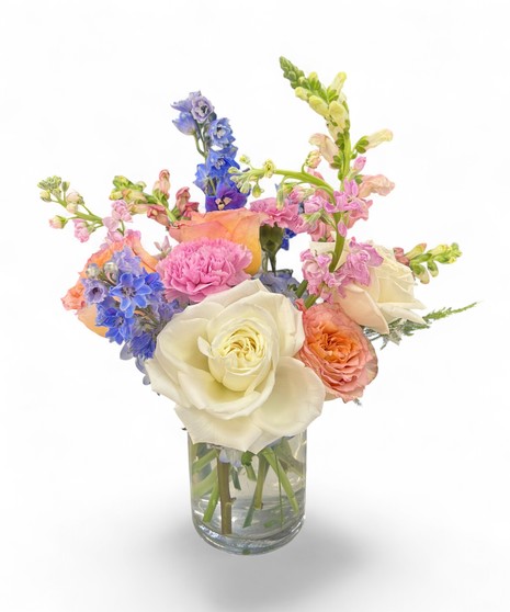 Soft, romantic, and full of fresh seasonal charm, Spring Sunset captures the gentle glow of golden hour in bloom. This airy arrangement features creamy ivory roses, peach and coral garden roses, delicate pink carnations, vibrant blue delphinium, and soft blush stock. Accents of fresh greenery add texture and movement, creating a naturally gathered, garden-inspired look.