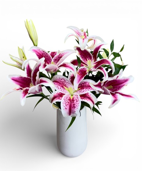 Stargazer Elegance is a bold and breathtaking arrangement featuring lush pink stargazer lilies accented with fresh, glossy greenery. Known for their dramatic star-shaped blooms and rich fragrance, these lilies create an unforgettable statement of beauty and sophistication. Designed in a modern white ceramic vase, this bouquet is perfect for celebrating life’s biggest moments—or making an everyday space feel extraordinary.